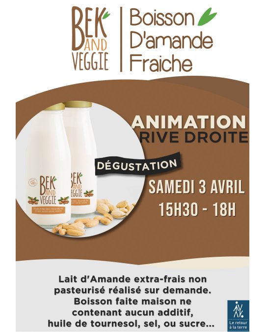 [ANIMATION] Le Retour à la Terre a le plaisir d'accueillir ce samedi 3 avril @bekandveggie sur Rive Droite pour vous faire découvrir leur boisson d'amande fraîche ! 😊
