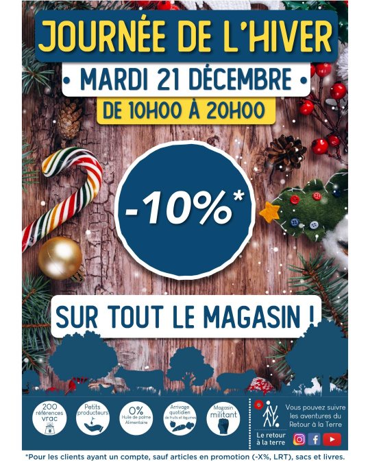 Et pour célébrer cette journée, Le Retour à la Terre vous offre -10%* (*Pour les clients ayant un compte, sauf articles en promotion (‑X%, LRT), sacs et livres.) de réduction ce Mardi 21 décembre de 10h à 20h.