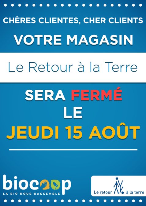 Fermeture des 3 magasins le Jeudi 15 Août! Date : 14 août 2019 Publié par Jeremy Tags : fermeture, jeudi, 15 août Nous serons de retour dès vendredi aux horaires habituels.. à très bientôt!