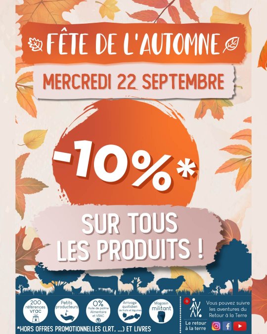 Le Retour à la Terre vous attend ce mercredi 22 septembre pour la journée de l’automne ! Profitez lors de cette journée de -10* sur tous les produits du magasin (*pour les clients ayant un compte et hors promotion LRT et livres) !