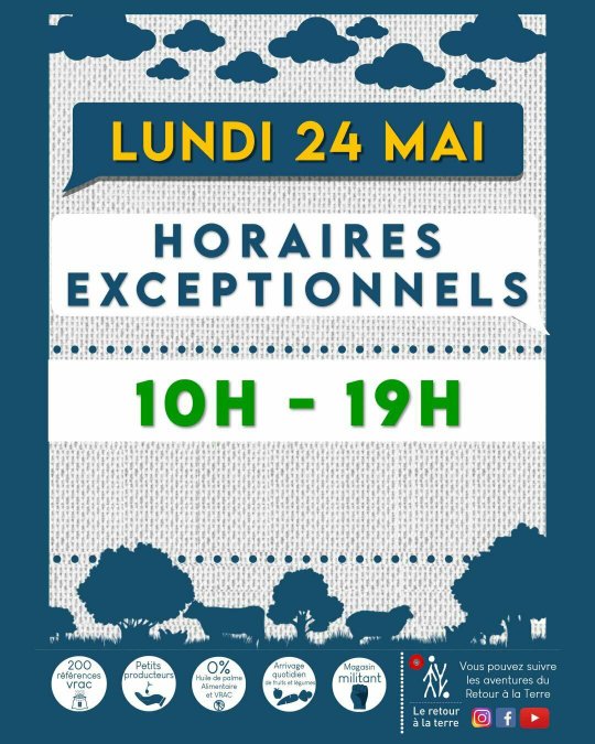 [HORAIRES] Nous sommes ravis de vous retrouver ce lundi 24 mai de Pentecôte de 10h à 19h !