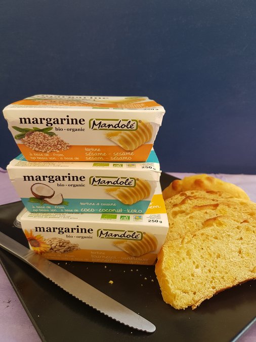 Toute cette histoire nous mène aux margarines Mandolé, entreprise ayant son siège en Andalousie. Elle propose une gamme 100% végétale, sans huile de palme, et employant de la lécithine de tournesol bio. Quatre variétés sont désormais disponibles dans vos magasins Le Retour à la Terre* : à l’huile de tournesol, de coco, d’olive et de sésame. Elles seront tout aussi bonnes sur des tartines que dans vos sandwiches ou vos recettes de pâtisserie.