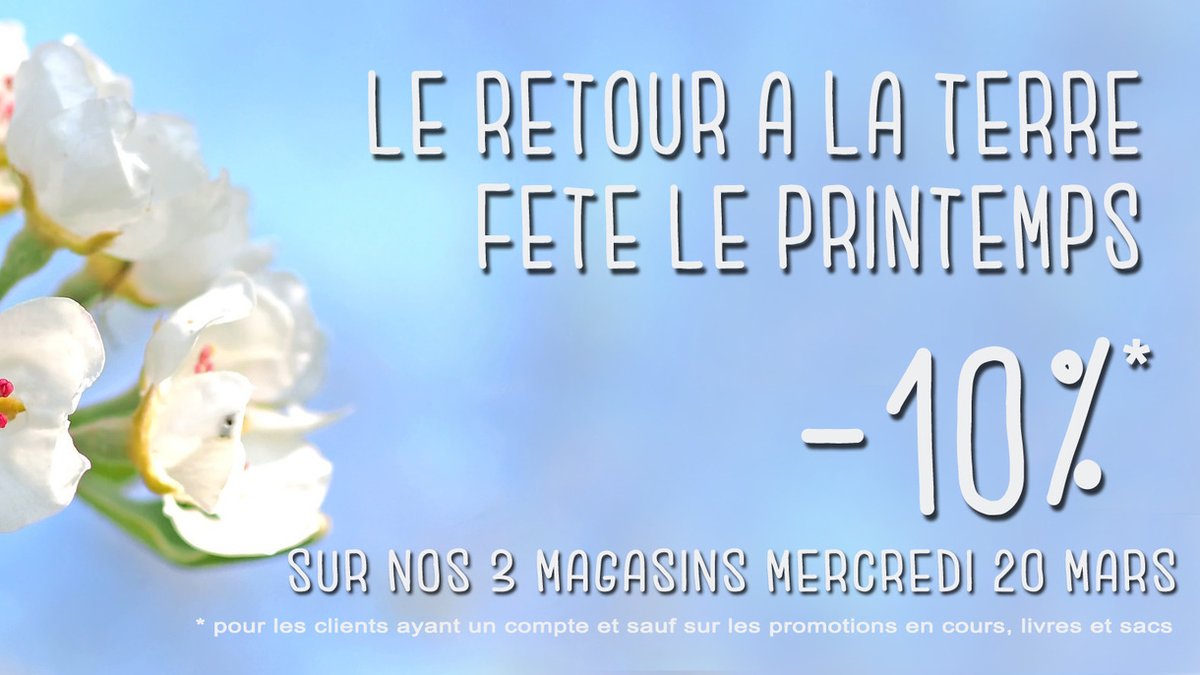 Venez fêter le retour des beaux jours avec nous et bénéficier de 10%* de réduction sur les 3 magasins le Retour à la Terre. De nombreuses animations et dégustations printanières sont prévues.