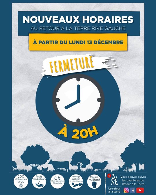 Le Retour à la Terre Rive Droite & Rive Gauche ferment désormais à 20h au lieu de 20h30 😊