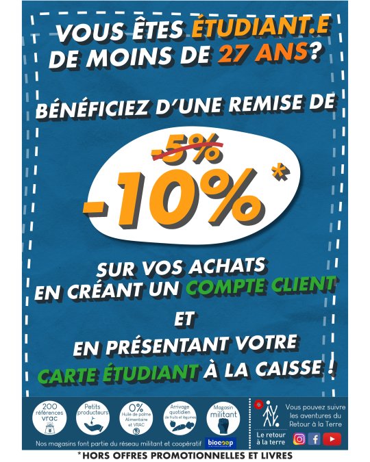 Les étudiants de moins de 27 ans peuvent bénéficier de cette remise de -10% sur tous les produits*(*Hors offres promotionnelles et livres) en créant un compte client Le Retour à la Terre et en présentant leur carte étudiant lors du passage en caisse. 😉