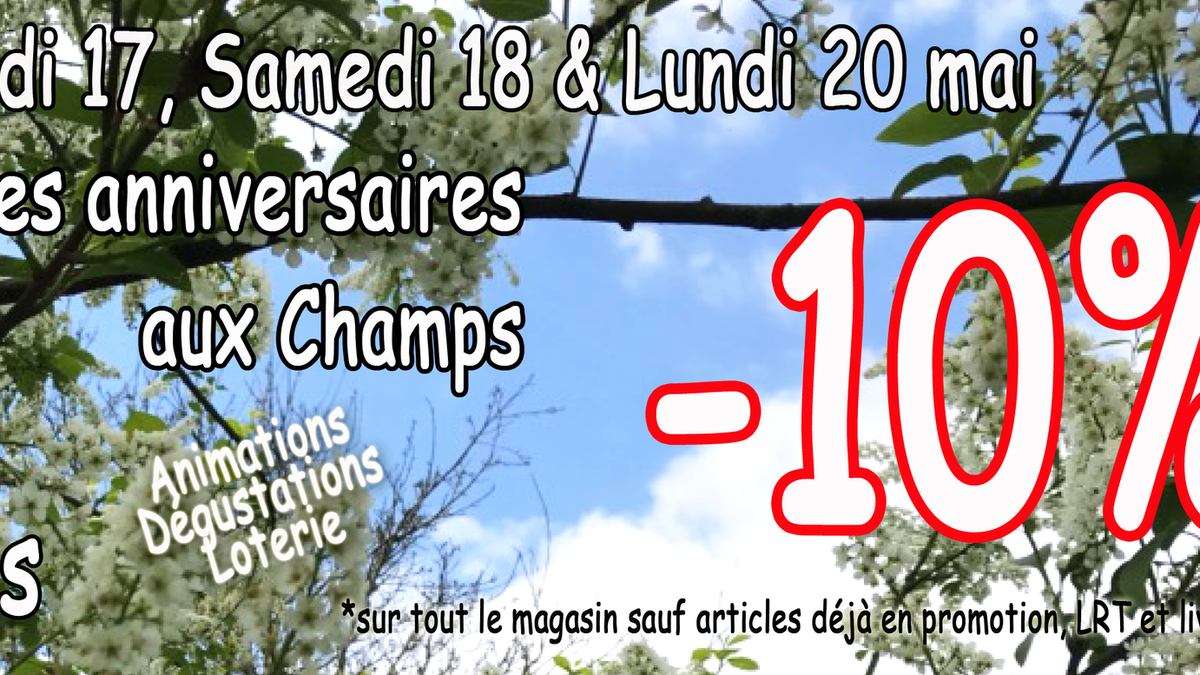 - A l'occasion de notre 3e anniversaire, venez profiter des trois journées anniversaire au magasin Les Champs. Au programme ? Une réduction de -10% sur tout le magasin (sauf articles déjà en promotion, LRT et livres) et une loterie avec de nombreux lots à gagner pour les clients ayant un compte ; sans oublier de nombreuses dégustations !